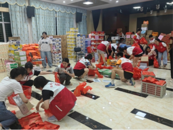 梅州市蕉岭县新时代文明实践中心组织志愿者开展防汛救灾应急物资搬运和分派工作。