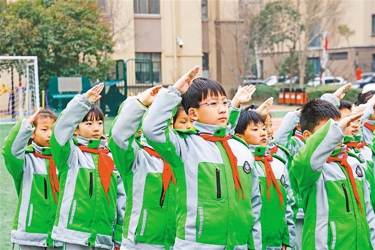 2月26日,在西安国际陆港第一小学举行的升国旗仪式上,少先队员行队礼。(记者 杨力 谢伟 摄)