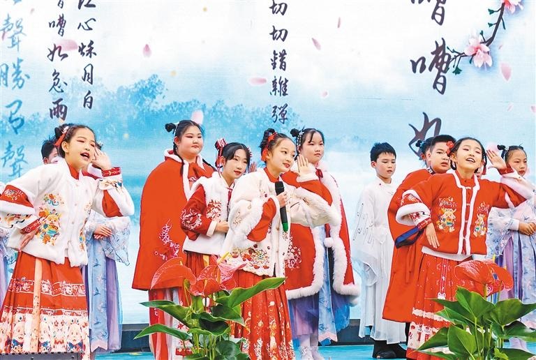 2月26日上午,在西安国际陆港第一小学,孩子们进行诗朗诵。(记者 杨力 谢伟 摄)