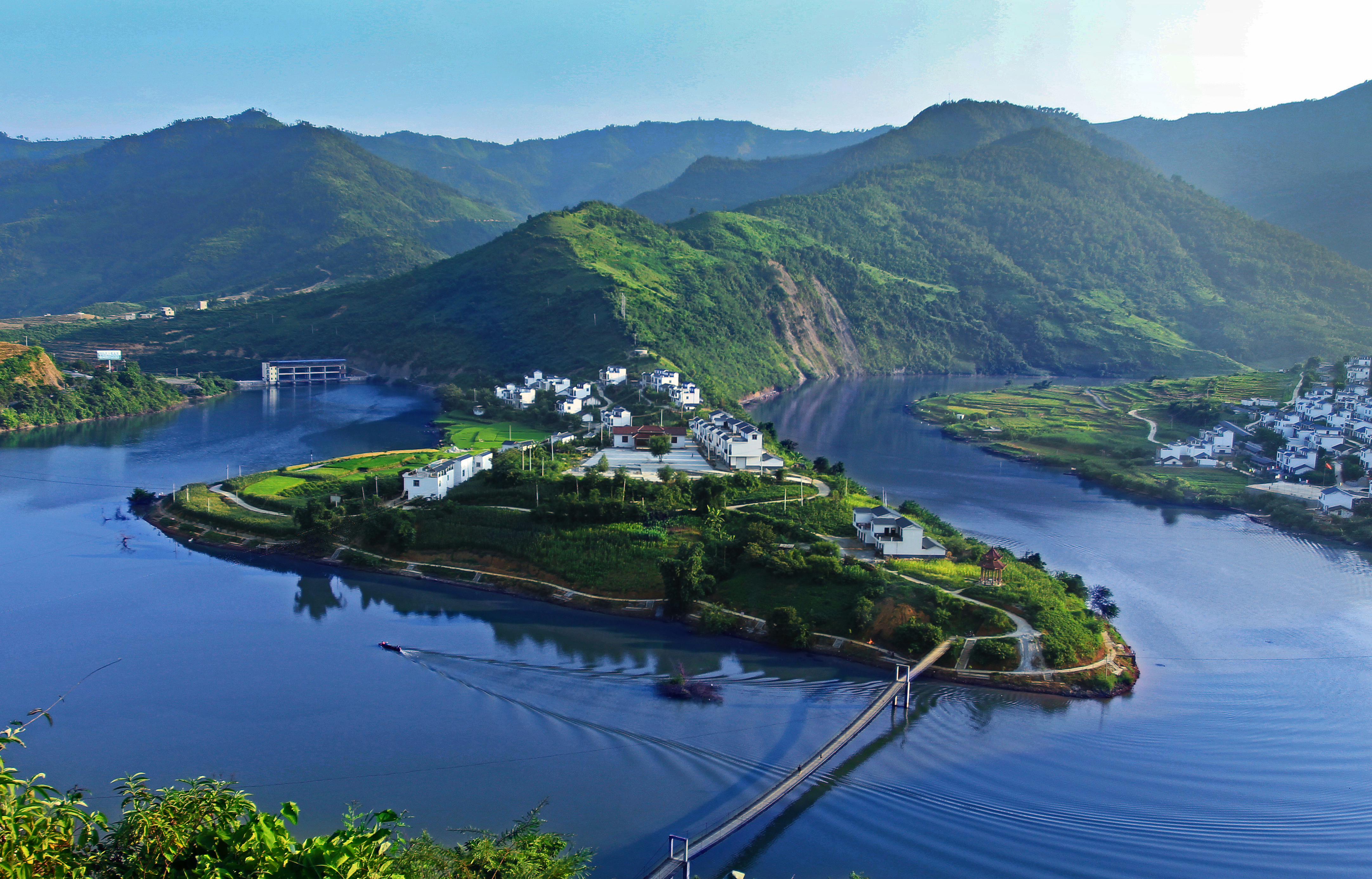 微波荡漾的美丽驮娘江环绕村庄