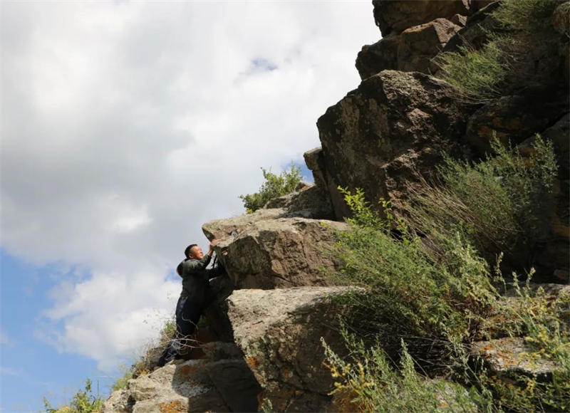 白巴嘎那爬上一处石山,架设红外相机。图片来源:新华社