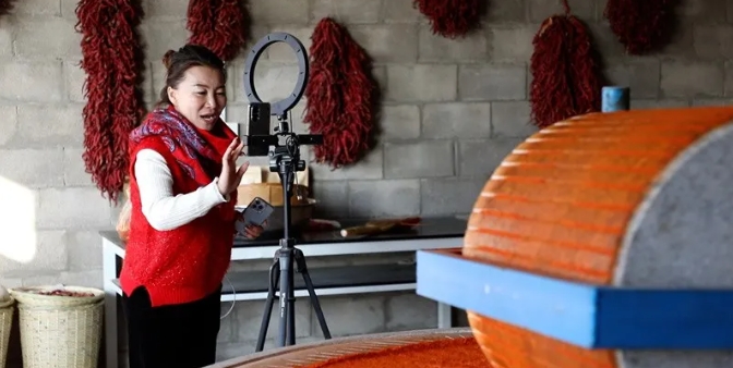 杨清艳通过网络直播方式销售环县庄子峁生态农庄辣椒面。甘肃省文明办供图
