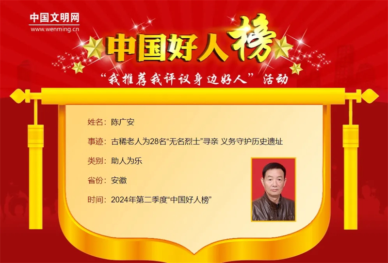 76年前,28位解放军战士在淮海战役颍河阻击战中牺牲,46年前,袁寨镇北照村村民陈广安许下承诺:要为这些烈士立纪念碑。为了这一句承诺,他多方走访收集烈士信息,终于在2008年4月4日建成淮海战役颍河阻击战烈士纪念碑。16年来,陈广安义务担任纪念碑守护人和讲解员,宣讲烈士故事,弘扬革命精神。2024年7月,陈广安荣登2024年第二季度“中国好人榜”。