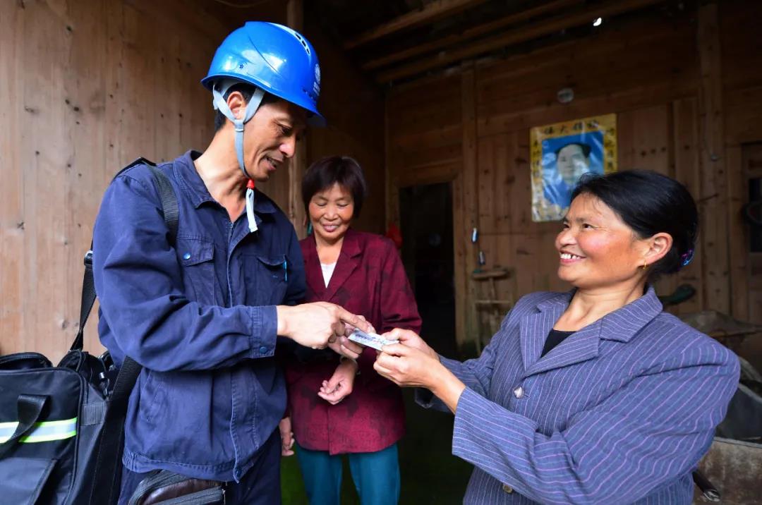 叶德奕到五保户李爱珍家维护线路,并留下写有他电话号码的名片。新华社记者 魏培全 摄