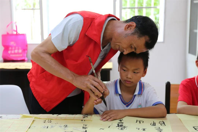 志愿者在书画室传授孩子书法。汪增泽 摄