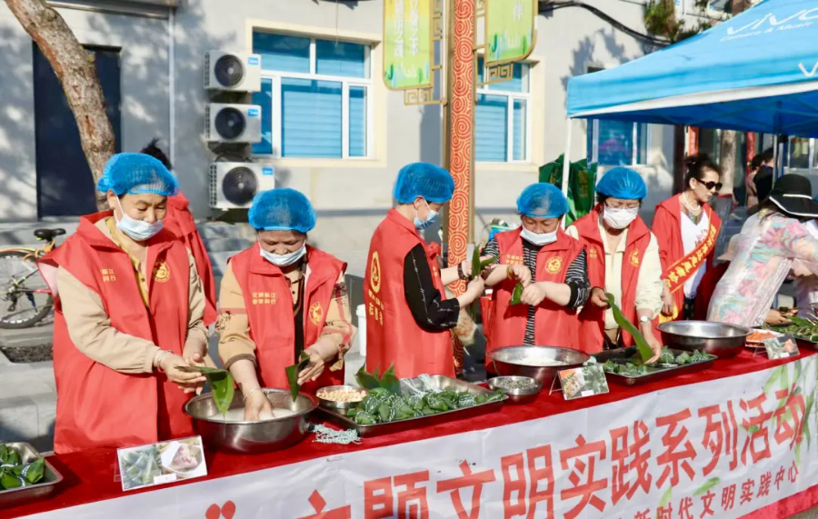 文明实践中心的志愿者带领市民和游客开展包粽子、制作香囊和五彩绳等传统活动。