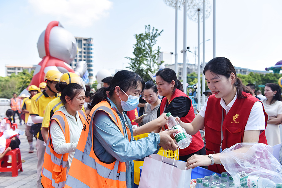 志愿者为户外工作者送去清凉礼包。