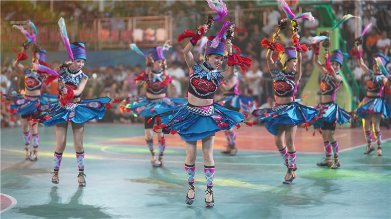 黔东南州台江县台盘村“六月六”吃新节举行的篮球赛中场休息时民族歌舞表演。 龙军 摄