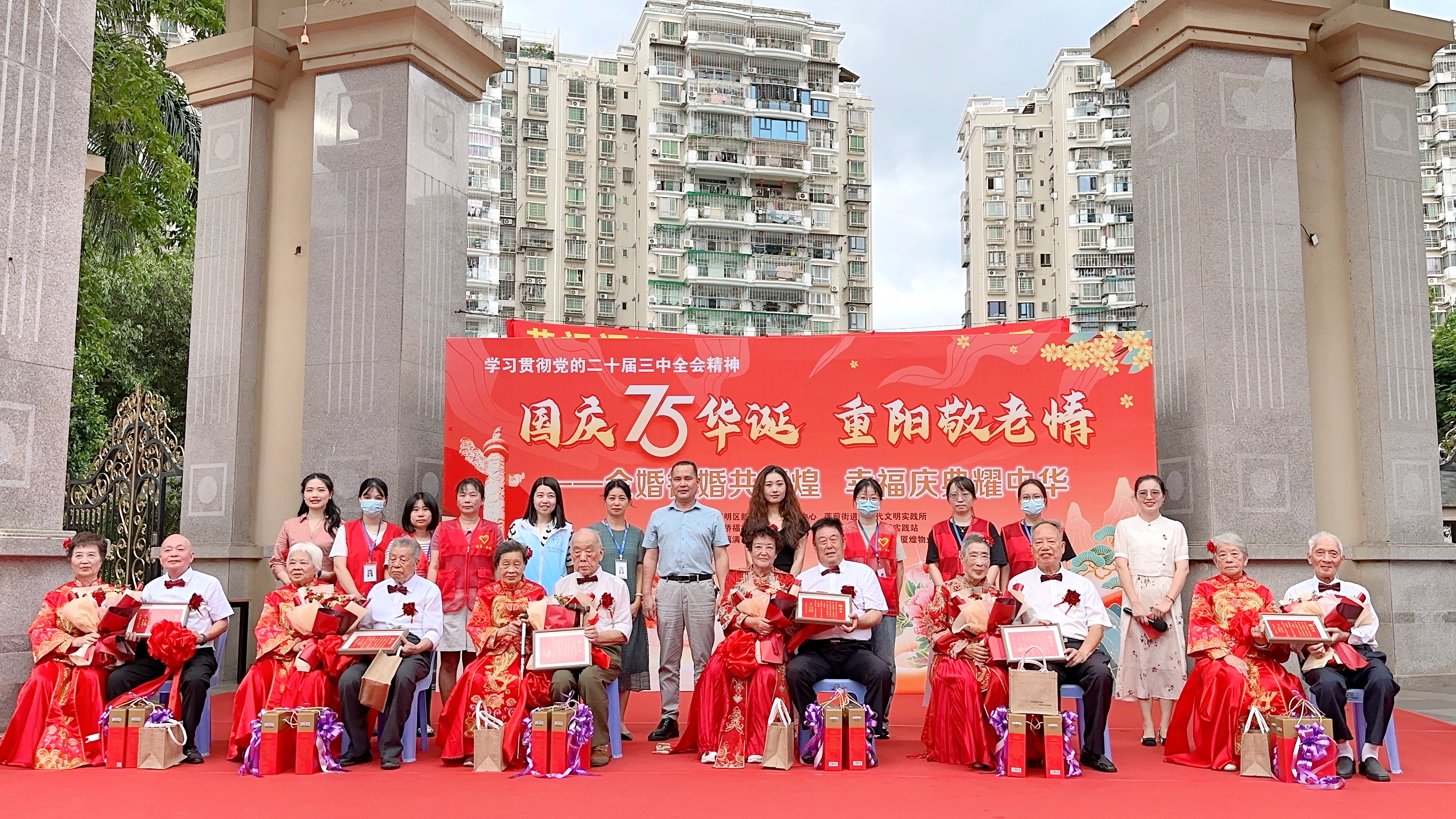 福建省厦门市思明区侨福社区新时代文明实践站举办“金婚银婚共辉煌”重阳敬老活动,社区金婚伉俪在居民的祝福与见证下,携手走过拱门,描眉、簪花、夫妻对拜、在婚书上按手印,营造了浪漫温馨的节日氛围。