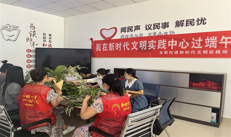山东省昌邑市组织开展“我在新时代文明实践中心过端午”主题文明实践活动,在奎聚街道新时代文明实践所,志愿者教居民们把艾草、菖蒲等做成花束,制作好的艾草花束清香四溢,营造出浓浓的端午节日气氛。