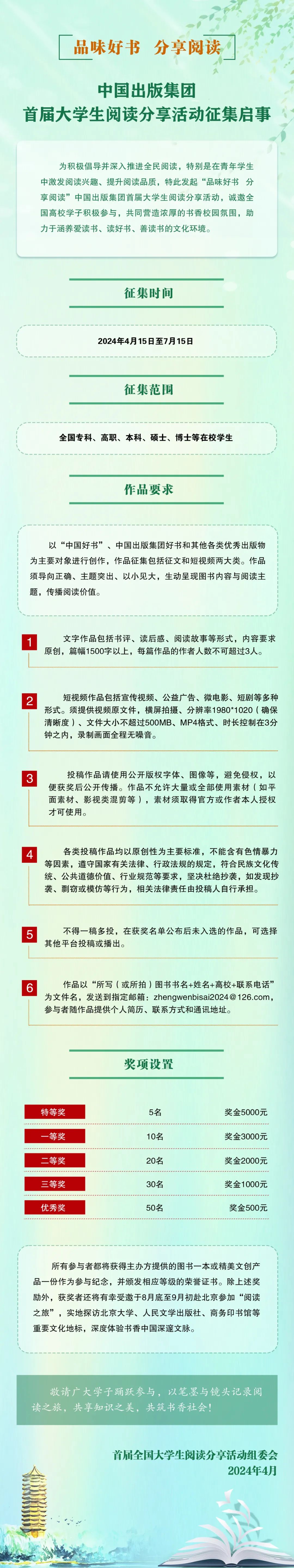 中国出版集团首届大学生阅读分享活动4月在京启动以来,面向全国高校开展阅读征文与短视频作品征集,并同步举办大学生与作家阅读分享活动。该活动由中国出版集团主办,北京大学出版研究院、中国出版传媒商报承办,人民文学出版社、商务印书馆、中华书局、生活·读书·新知三联书店、中国大百科全书出版社和荣宝斋协办。