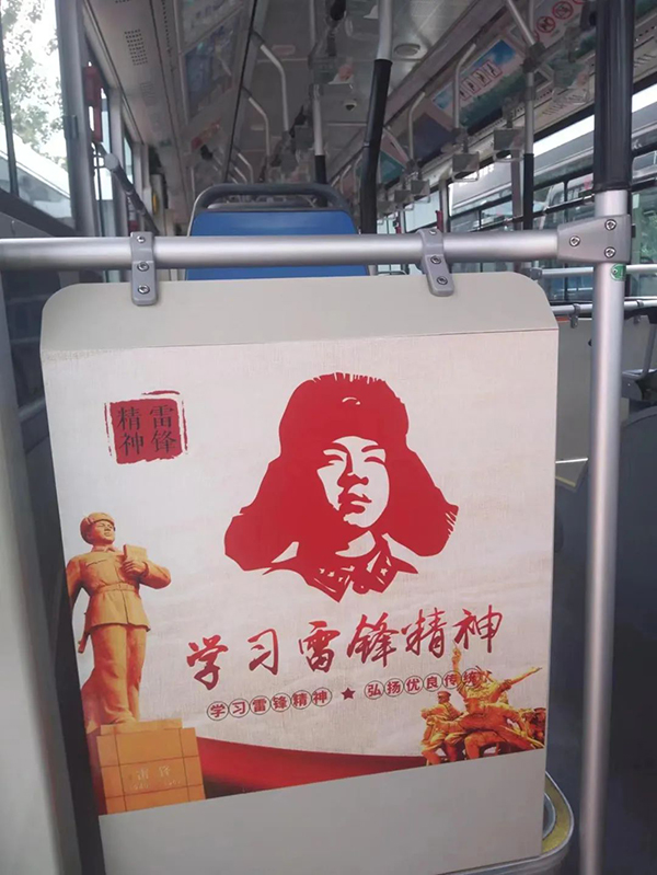 上车后,不少市民和杨女士母女一样,登车后被车厢上雷锋精神主题的宣传板吸引,有的还会拍照留念。