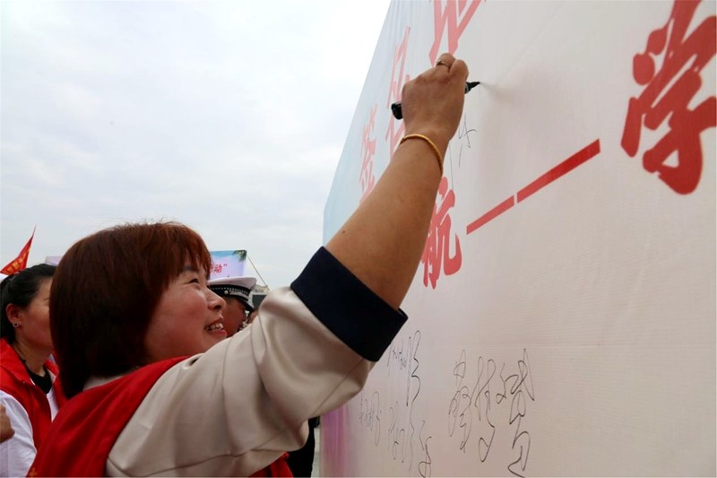 爱心志愿者们在“爱心助考 为梦护航”签名墙上签字