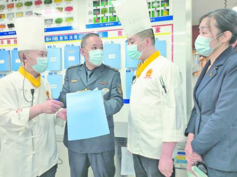 随后,执法人员进入后厨,检查食品安全情况。检查结束,执法人员指出问题所在,如并非所有餐桌上摆放有制止餐饮浪费的消费提示;用于展示的菜品未按照要求详细标注克数、适合几人用餐等信息,未区分大小份;未将制止餐饮浪费工作纳入员工培训内容,要求酒店立即整改。一旁的工作人员认真记录整改内容。