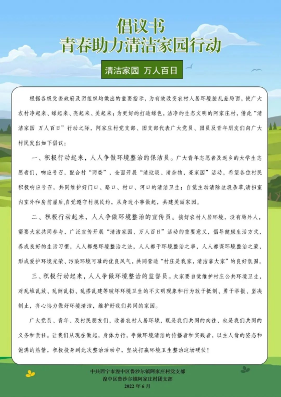 为深入贯彻落实各级党委政府关于“清洁家园”环境专项整治行动的安排部署,进一步提高环境卫生整治成效,在村党支部引领下,充分发挥群团组织桥梁纽带作用,有效彰显广大团员青年志愿者主力军和突击队的作用,阿家庄村团支部组织团员青年开展“青春助力、清洁家园”环境卫生整治主题活动。