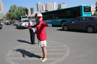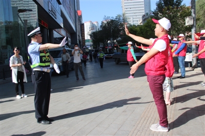 场景:“这个地方不能横穿马路,那里是过街天桥,请走过街天桥……”6月15日9时10分,对着一名企图要横穿马路的市民说完这些话的“市民交警”王生姐很紧张,不仅涨红了脸,而且手心里也攥出了汗,不过,她顺利完成了此环节的体验活动。接下来,其他“市民交警”也陆续进行了体验,劝导一些行人放弃横穿马路改走过街天桥了。