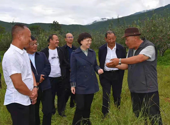 玉龙县鸣音镇鸣音村委会中罗村民小组的和作周是个苹果种植大户,自家种植面积有400多亩,带动周边种植4000余亩。浦虹参观了他家的冷库和果园。了解到和作周把高品质的苹果卖到了大城市,浦虹高兴地说:“看到幸福写在了你脸上。”