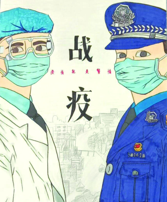 高邮市南海中学七(7)班学生高胜寒的作品是一幅海报,这幅主题为“战疫”的海报上呈现的是戴着口罩的医生和警察的形象。