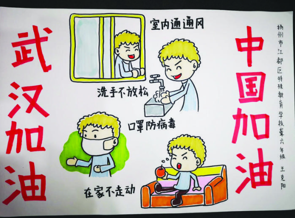 “室内通通风”“洗手不放松”……江都区特殊教育学校六年级王克阳同学创作的画作从普及防疫知识宣传入手,四个主题每个都紧扣防疫知识,还配上宣传文字。画作通过漫画人像展现,整幅画作简洁易懂,并以文字的形式展现作者心声:武汉加油!中国加油!