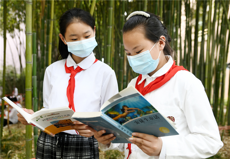 4月23日是第27个“世界读书日”。连日来,扬州市花园小学为落实“双减”政策,培养学生良好的阅读习惯,组织开展了一系列丰富多彩的读书活动。在校园内掀起读书热潮,教室里、图书室、小竹林、操场上,随处可见同学们读书的身影,让阅读成为习惯,在读书中快乐成长。(扬州发布 记者 庄文斌 摄)