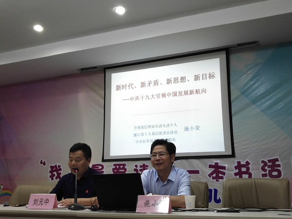 为深入学习贯彻十九大报告精神,用习近平新时代中国特色社会主义思想武装头脑、指导工作,6月8日,实验幼儿园党支部特邀请“全国基层理论宣讲先进个人”、“浙江省十大基层优秀宣讲员”、湖州市长兴县委党校副校长施小荣,为党支部全体党员作了题为“新时代 新思想 新矛盾 新目标——中共十九大引领中国发展新航向”的学习十九大报告精神专题党课。
